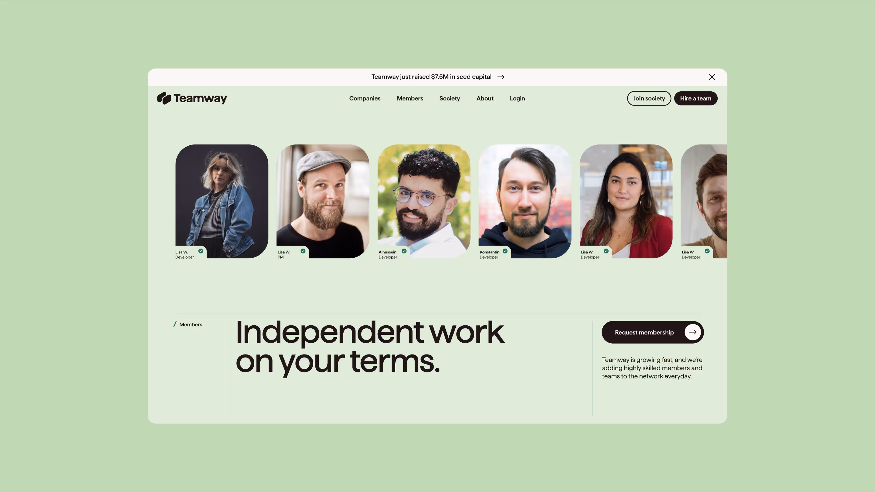 Teamway is pioneering the future of work by creating a global society for the elastic workforce. Their platform unites ambitious companies with world-class freelance tech teams through a community-driven, remote-first marketplace built on trust.